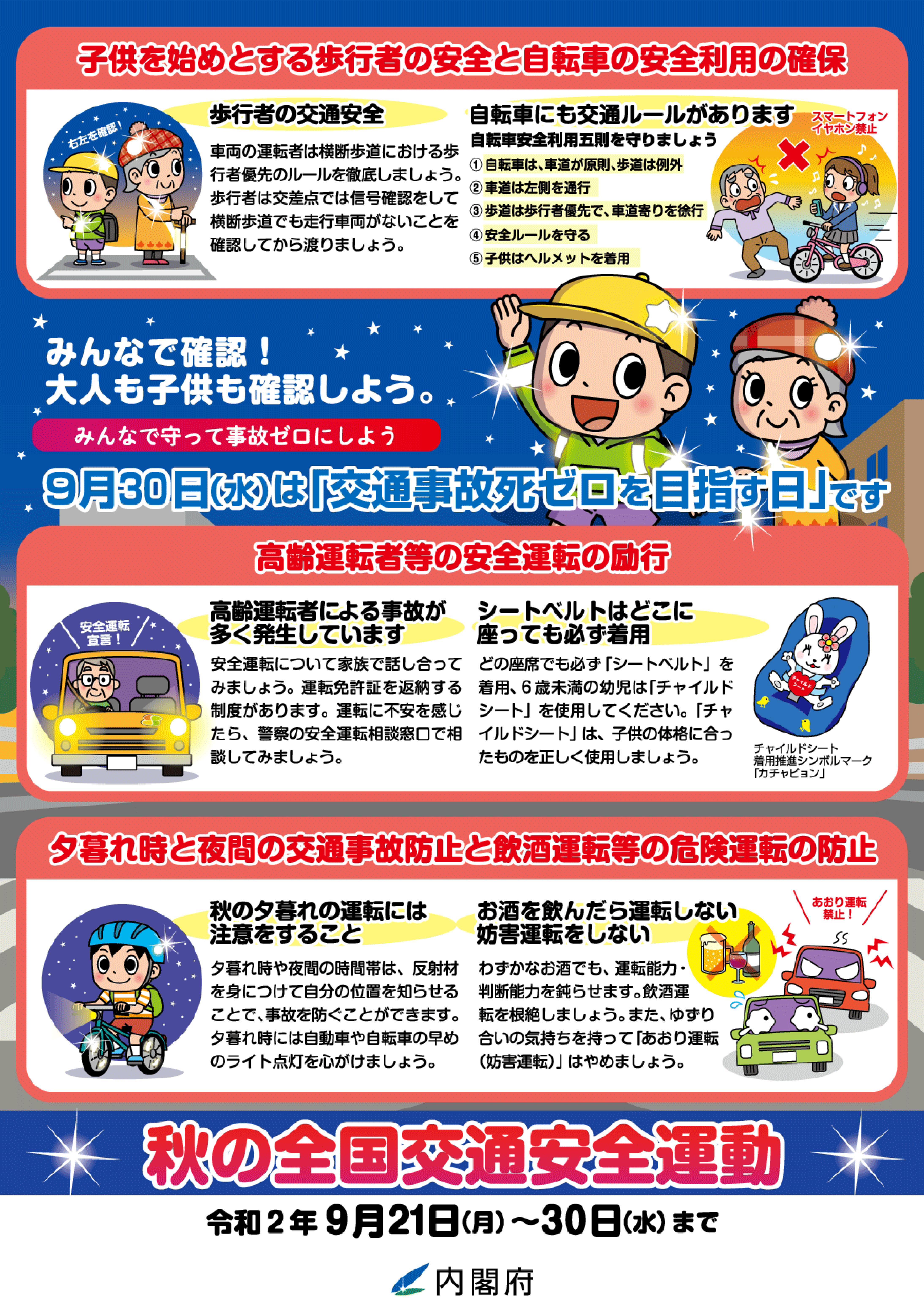また、運動期間中の9月30日は「交通事故死ゼロを目指す日」です。目標を達成できるよう心がけてください。